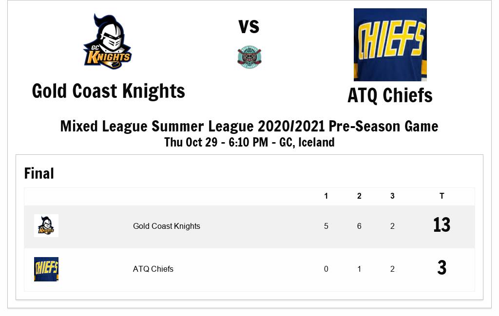 Mixed League - ATQ Chiefs was beaten by Knights 3 - 13 in Pre-Season. For Knights, Robert Orosz got on the scoresheet with 5 Goals, 3 Assists, 8 Points. Milan Novysedlak got on the scoresheet with 5 Assists, 5 Points. Harley Anderson pitched in with 4 Goals, 2 Assists, 6 Points. Robert Orosz garnered 1st Star. Milan Novysedlak was given 2nd Star. For ATQ Chiefs, Elijah Allen wowed the crowd with 20 Saves. Oliver Fenwick ground out 1 Goal, 1 Points. Visit the game page at: http://iceland.hockeysyte.com/game/779