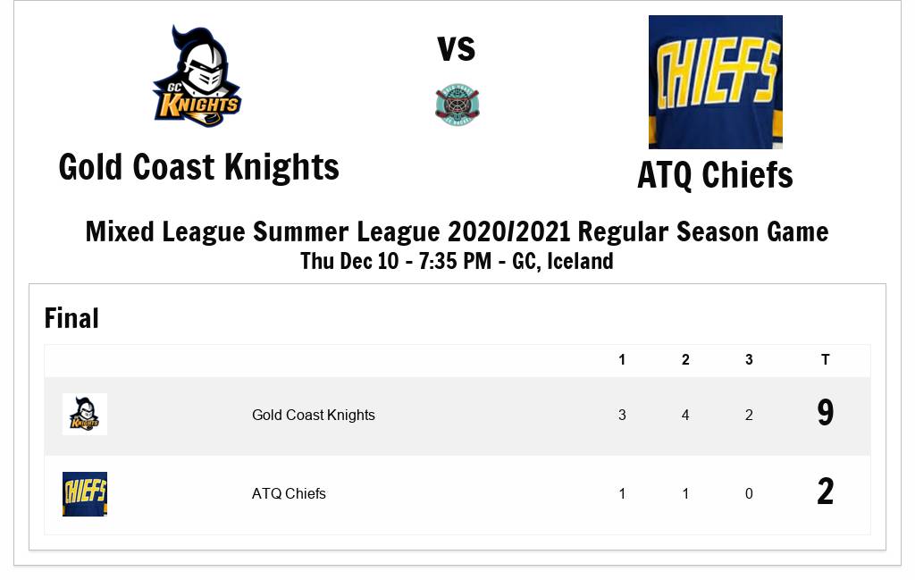 Mixed League - ATQ Chiefs fell against Knights 2 - 9. For Knights, Harley Anderson got on the scoresheet with 5 Goals, 2 Assists, 7 Points. Robert Orosz ground out 2 Goals, 2 Points. Nick Novysedlak tallied 2 Assists, 2 Points, 24 Saves. Harley Anderson was awarded 1st Star. Robert Orosz was awarded 3rd Star. For ATQ Chiefs, Elijah Allen tallied 19 Saves. Elijah Allen garnered 2nd Star. Visit the game page at: http://iceland.hockeysyte.com/game/790