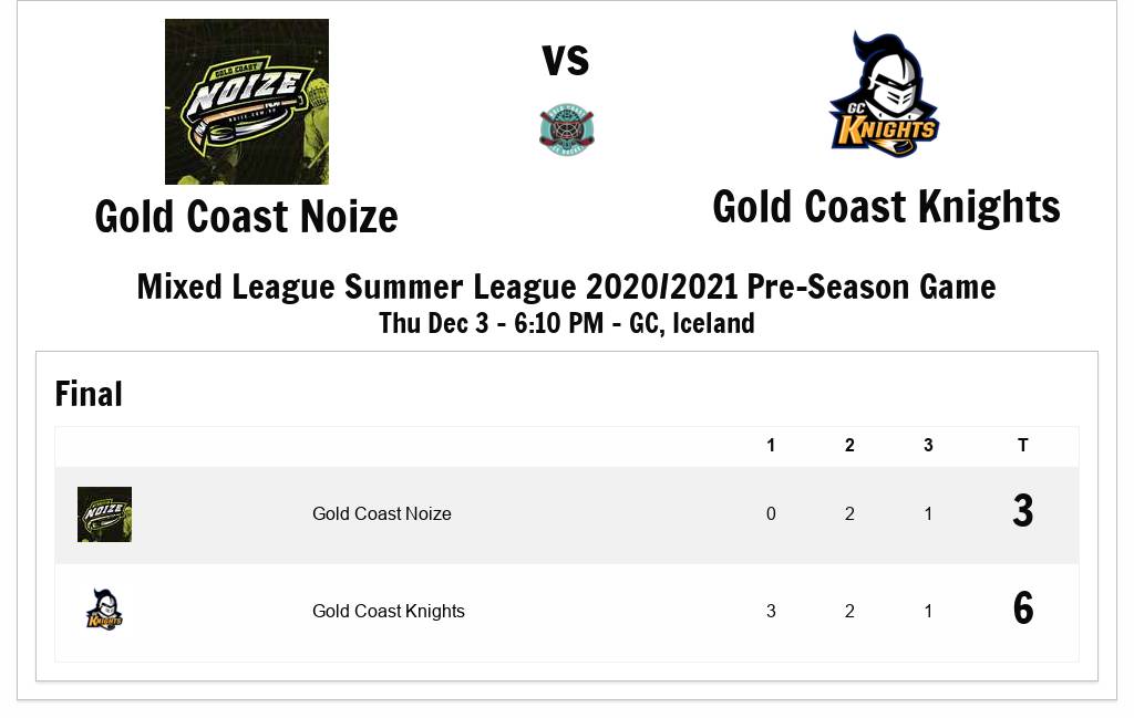 Mixed League - Knights edged out Noize 6 - 3 in Pre-Season. For Knights, Harley Anderson pitched in with 3 Goals, 2 Assists, 5 Points. Nick Novysedlak got on the scoresheet with 20 Saves. Robert Orosz wowed the crowd with 2 Goals, 2 Assists, 4 Points. Harley Anderson was awarded 1st Star. Nick Novysedlak garnered 3rd Star. For Noize, Ian D'Andrade was a force with 2 Goals, 2 Points. Ian D'Andrade was awarded 2nd Star. Visit the game page at: http://iceland.hockeysyte.com/game/787